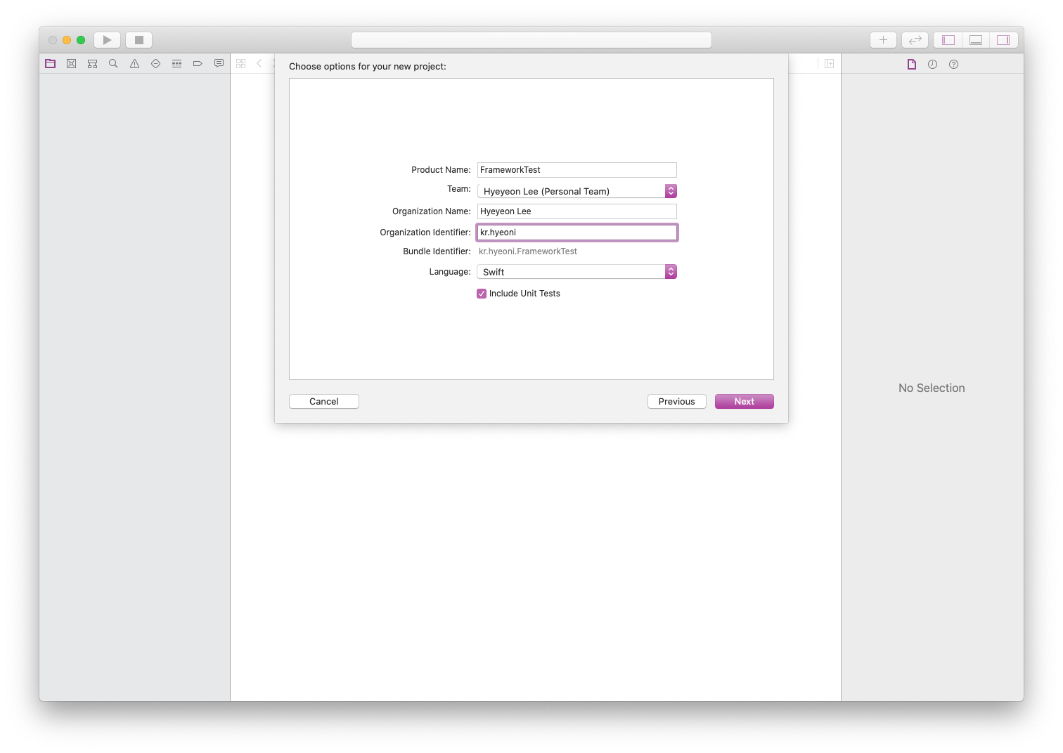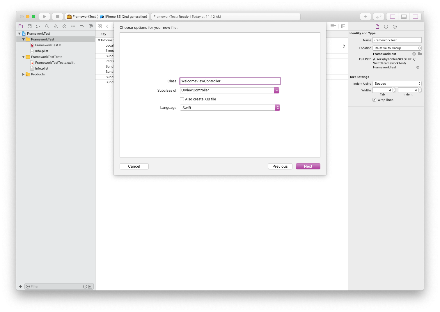 - Xcode에서 Framework를 선택 후 원하는 이름을 선택하여 생성한다.