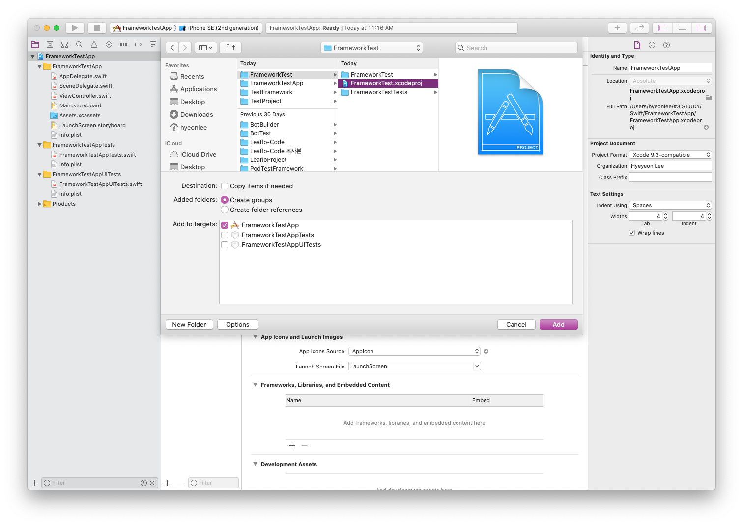- 만든 Framework의 .xcodeproj를 불러온다.