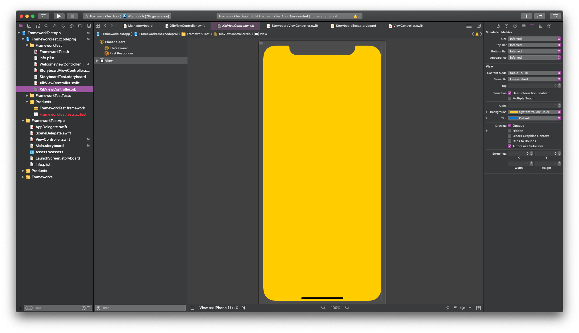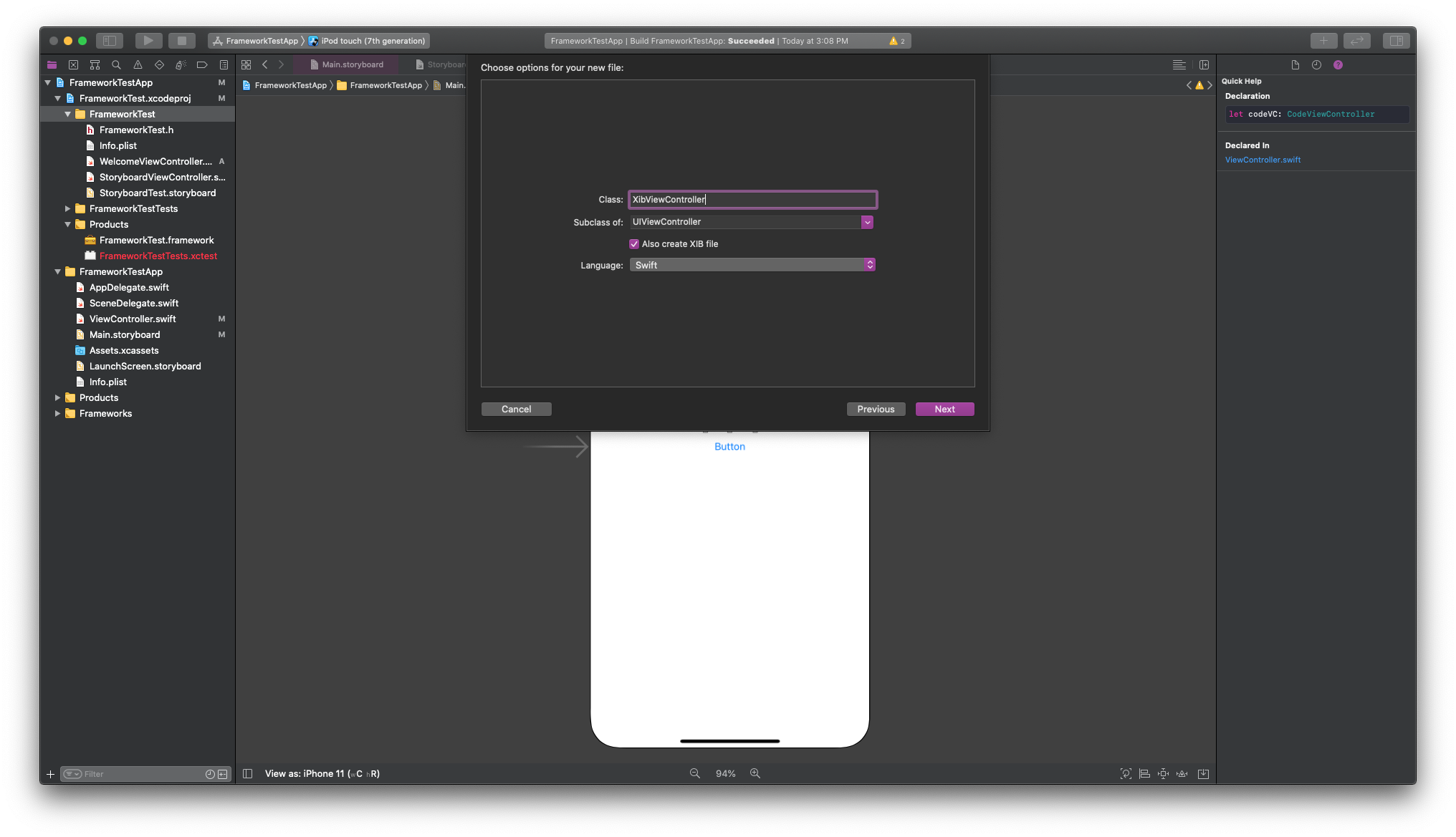 프레임워크에 XibViewController라는 이름의 ViewController를 생성하였고 XIB 파일도 같이 생성했습니다.