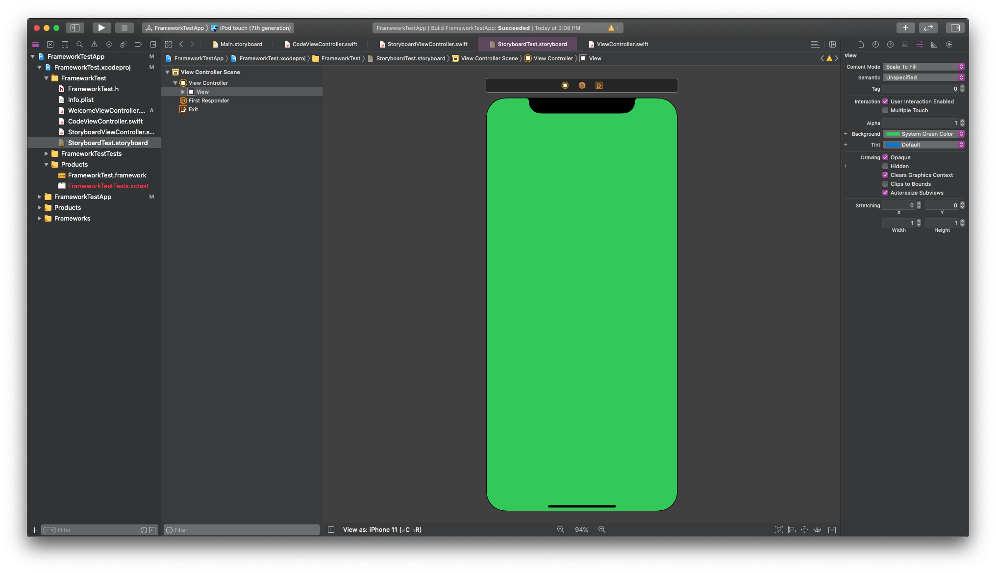 StoryboardTest라는 이름의 스토리보드를 만들고 뷰 컨트롤러를 추가해서 배경색을 초록색으로 바꾸었습니다.