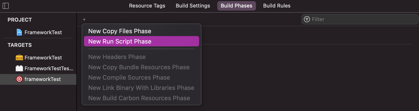 Build Phases 메뉴에서 + 버튼을 눌러서 New Run Script Phases 를 추가합니다.