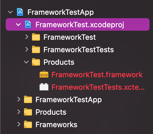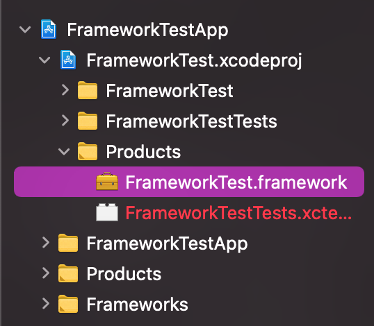 좌측 패널의 Products 폴더를 보면 FrameworkTest.framework 파일이 생긴 것을 볼 수 있습니다.